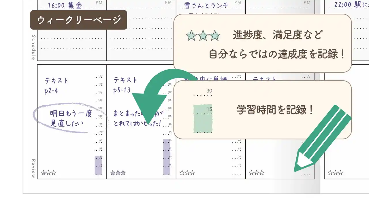 Re:Buddyの大きな特長のひとつは、目標ページと週間スケジュールを同時に確認できる見開きレイアウト。週のどこにいても学習計画全体を把握でき、長期目標と日常タスクの両立が可能です。 |