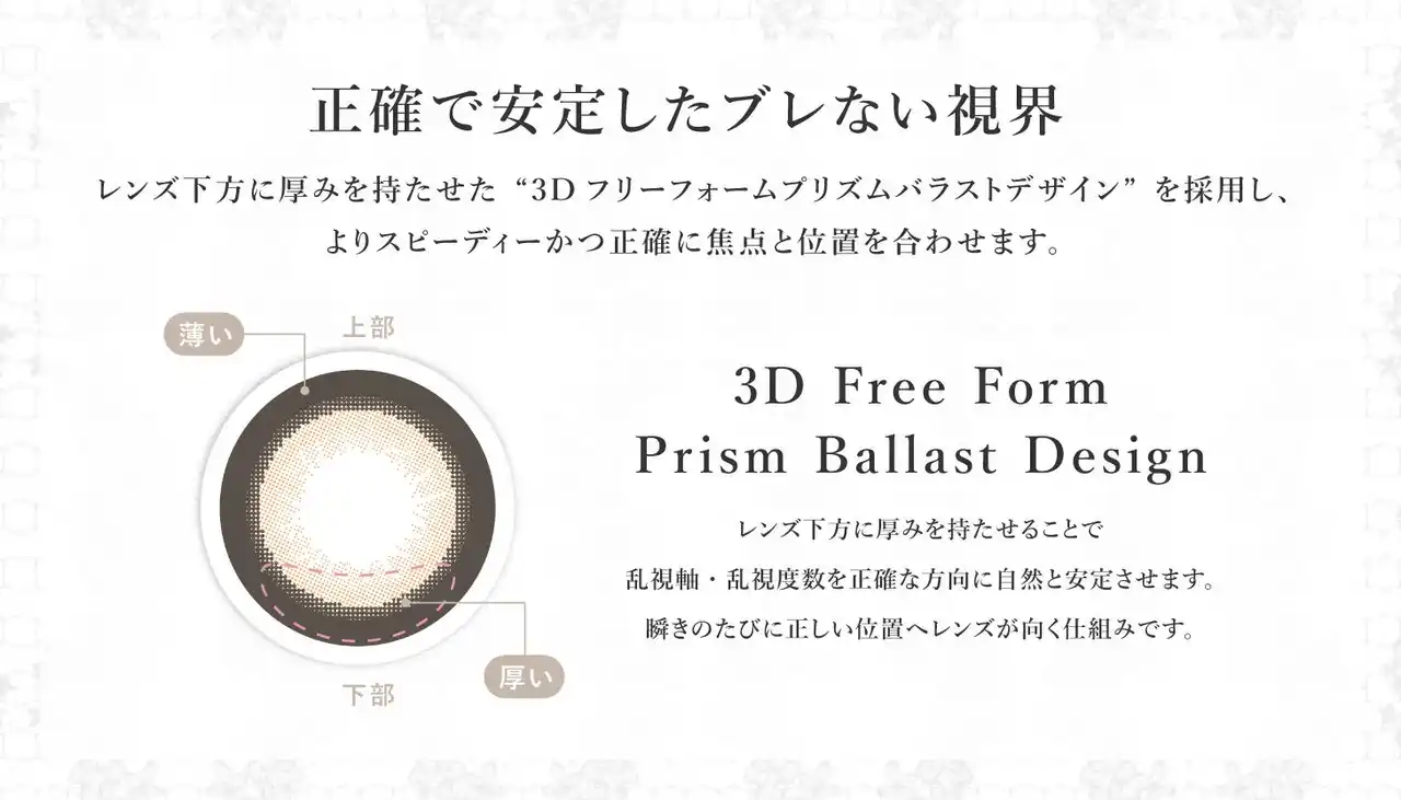 レンズの下方に厚みを持たせ、上部は薄く整えることで、乱視軸・乱視度数を正確な方向に自然と安定させます。瞬きの度に、正しい位置にレンズが向く仕組みで、よりスピーディーかつ正確に焦点と位置を合わせます。 |