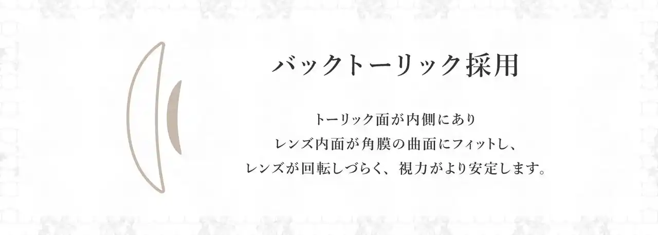 バックトーリックデザインは、トーリック面が内側にありレンズ内面が角膜の曲面にフィットし、レンズが回転しづらく視力がより安定します。 |