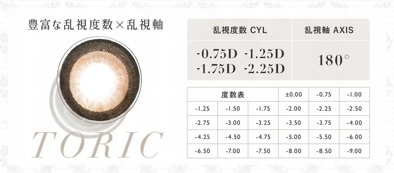 乱視度数(CYL):-0.75 D/-1.25 D/-1.75 D/-2.25 D |