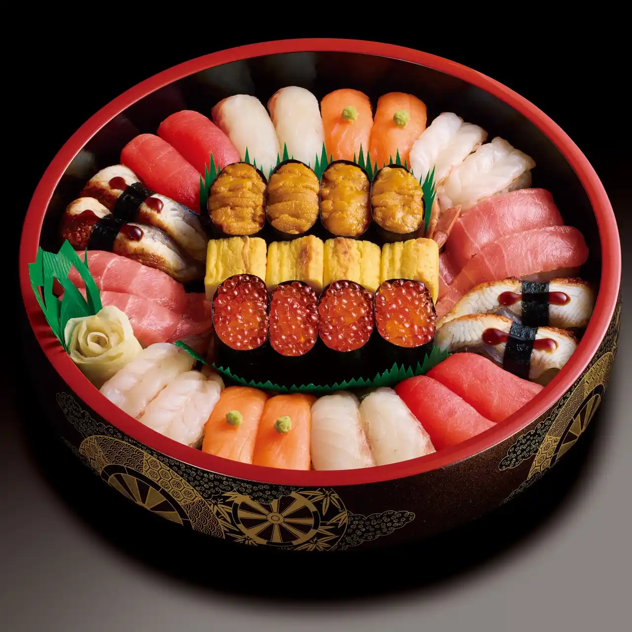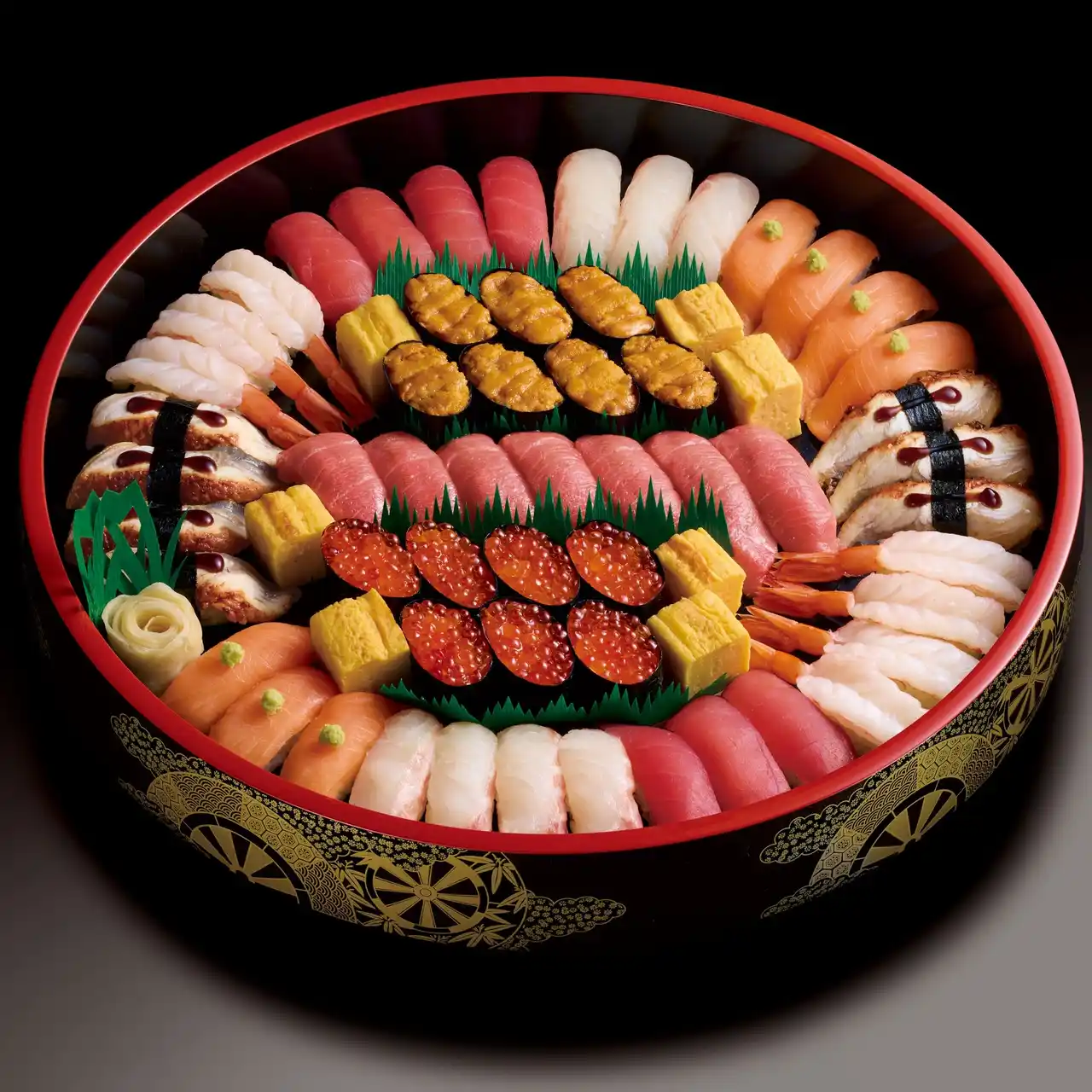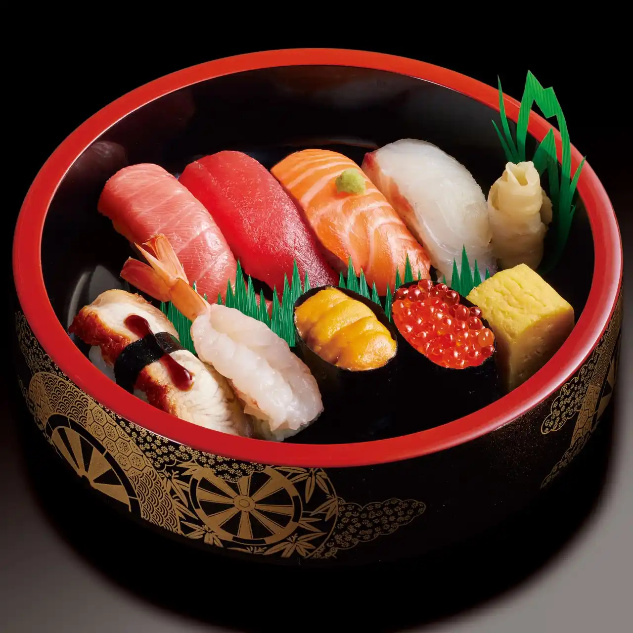 | マグロ、真鯛、特選サーモン、うなぎ、生エビ、ウニ軍艦、中トロ、イクラ軍艦、切玉子 | |||||||||||