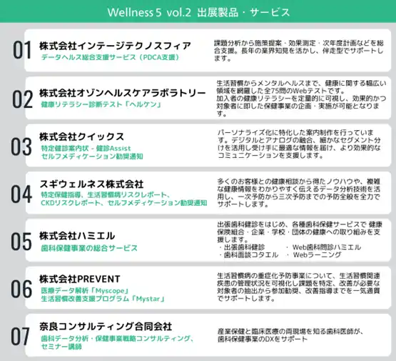 Wellness 5 Vol.2 2025では、特定健診・特定保健指導、健康経営、コラボヘルス、職場の健康づくりに関連する幅広い製品やサービスが紹介されます。出展企業には、株式会社クイックス、スギウェルネス株式会社、株式会社オゾンヘルスケアラボラトリー、株式会社ハミエル、株式会社PREVENT、株式会社インテージテクノスフィア、奈良コンサルティング合同会社が含まれています。 |