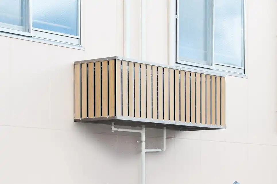 | デザイン面でも、建物の景観や外観イメージを損なわないよう配慮されており、機能性と意匠性を両立しました。木目調の縦格子が外観にやわらかさを与え、設置場所の美観を保ちながら室外機をスマートに隠すことができます。機能性、施工性、デザイン性の三拍子がそろった、これまでにない新しい室外機置場です。 | |||