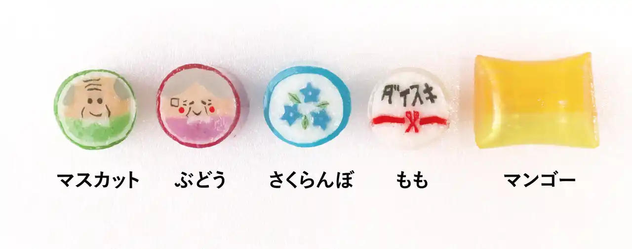 | キャンディには、笑顔のじぃじとばぁばの絵柄に加え、長寿を象徴する花「リンドウ」と「ダイスキ」のメッセージをデザインしました。フレーバーは子どもから大人まで楽しめる人気のフルーツが中心です。外側の色味まで丁寧に調整し、キャンディ全体が華やかで明るい印象になるよう工夫しています。 | |||||||||
