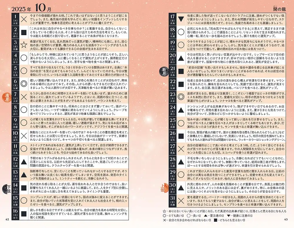 2025年10月月運。2025年10月~2026年12月までの運勢を月別・日別にチェックできる |