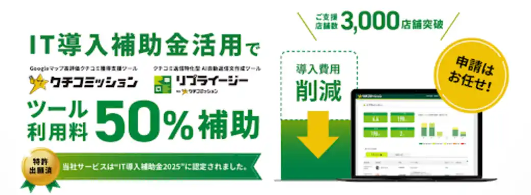 「クチコミッション」および「リプライージー」は、経済産業省が推進するIT導入補助金2025の対象ツールとして登録されました。 |