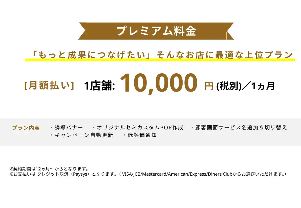 本プランでは、クチコミ投稿後のユーザー行動を自然に誘導する「バナー機能」や、複数店舗・サービスの柔軟な管理を実現する「サービス名切り替え機能」、ネガティブな意見を即時把握できる「低評価通知」など、マーケティングと運用の両面を支援する機能を多数追加しました。 |