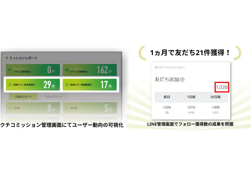 クチコミッションページに「LINE友だち追加」バナーを設置し、ユーザーの行動を数値で可視化。 |