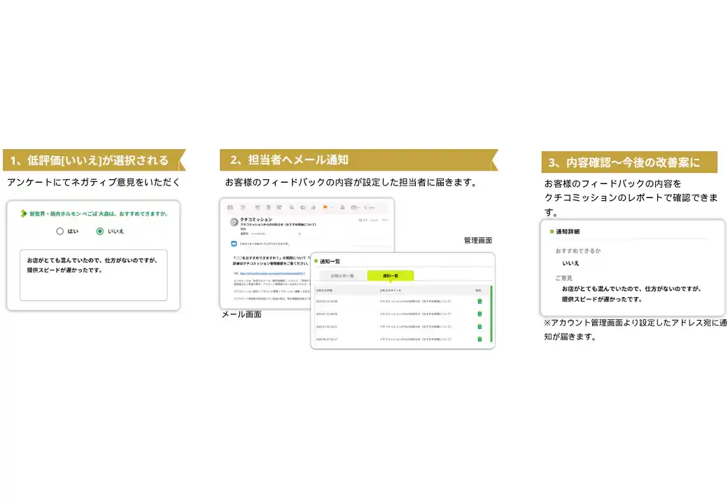 低評価アンケート通知を活用することで、お客様からのネガティブなご意見をいち早く把握し、迅速な対応が可能に。 |