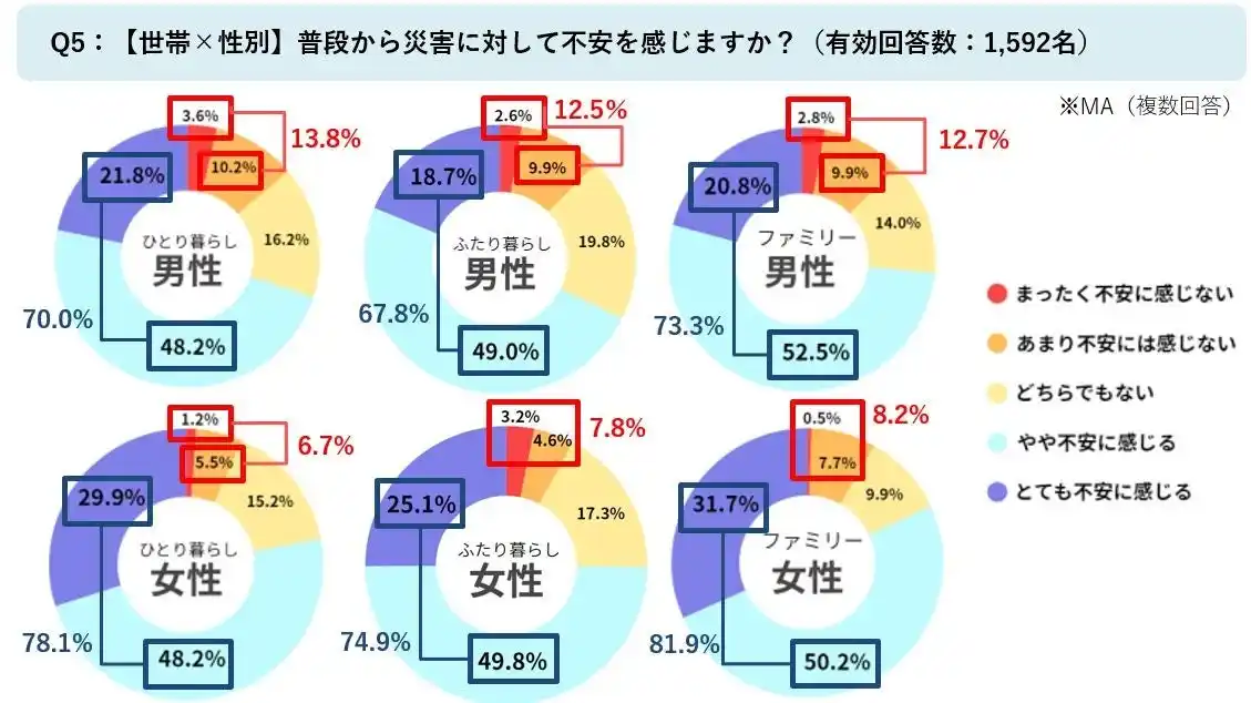 災害に対する不安については、「とても不安に感じる」と回答した人が全体の2~3割にのぼり、「やや不安に感じる」を含めると、日頃から不安を抱いている人は全体の約7割に達しました。世帯と性別の特徴を見ると、いずれの世帯でも女性の方が不安を感じている割合が高く、最も高かったのはファミリー女性の81.9%に。一方で「まったく不安に感じない」または「あまり不安には感じない」と回答した割合は、ひとり暮らし男性が13.8%と最も高く、ひとり暮らし女性は6.7%にとどまり、男女間で約2倍の差があることが分かりました。 |