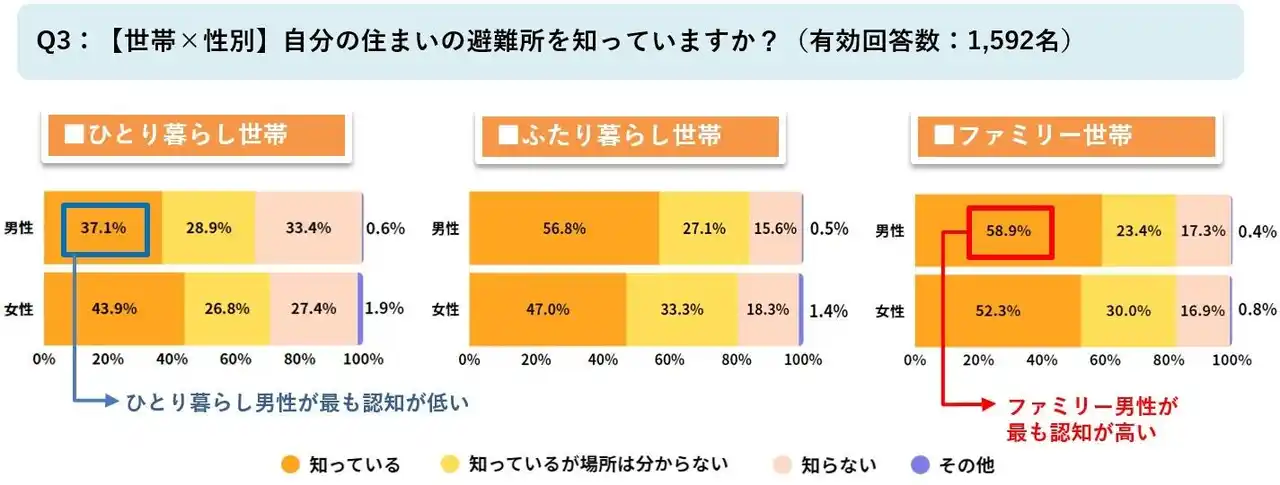 避難所の場所を正確に把握していると回答した人は、ファミリー世帯が最も高く、男女ともに半数を超えているのに対して、ひとり暮らし世帯では半数未満にとどまる結果に。ひとり暮らし男性では、避難所の認知が全属性の中で最も低い37.1%で、ファミリー男性の58.9%と比較すると2割以上の差が出ました。また「避難所は知っているが、正確な場所は分からない」と回答した人がどの世帯も3割程いることから、スマホや地図アプリが使えない可能性がある災害時に不安の残る結果といえます。災害時に安心して避難できるよう、災害が起きる前に、自宅や最寄り駅から避難所までのルートを一度歩いて確認しておくと良いでしょう。 |