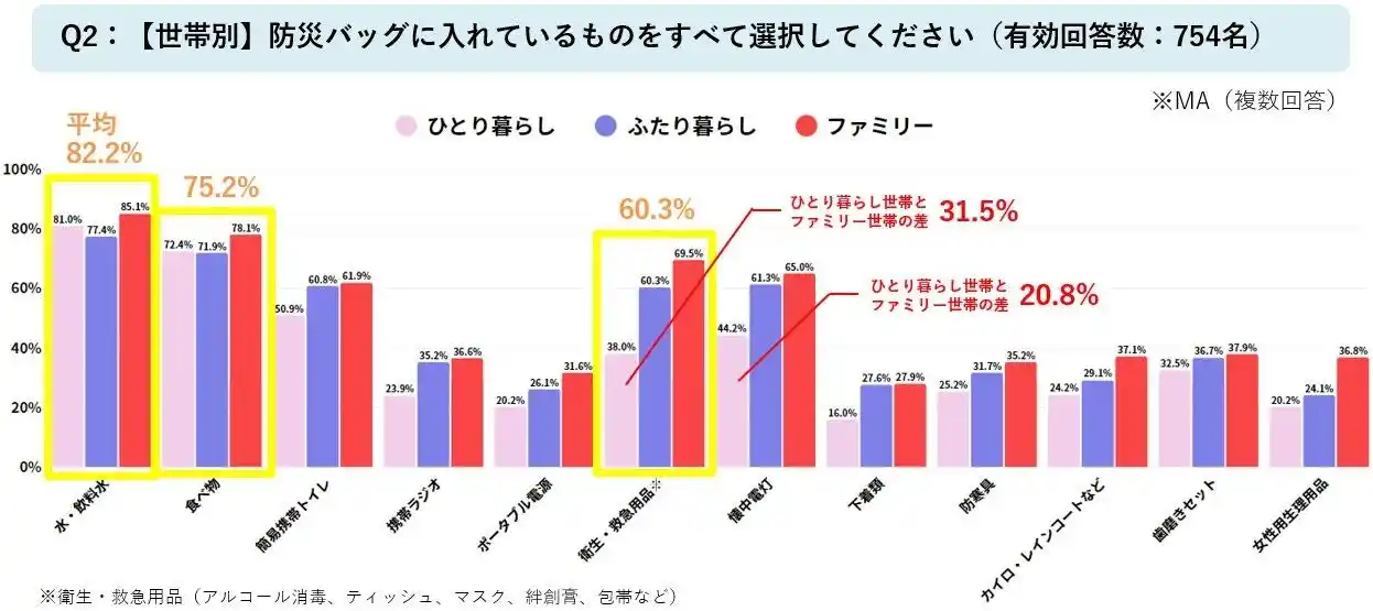 防災バッグを用意していると回答した人に、中身について尋ねたところ、最も多かったのは「水・飲料水」で82.2%、次いで「食べ物」75.2%、「衛生用品・救急用品」60.3%、「懐中電灯・ランタン・ヘッドライト」59.4%、「簡易トイレ」59.1%という結果となりました。ひとり暮らしに注目すると、全体的に他の世帯よりも入れている品目の割合が低い傾向にあります。