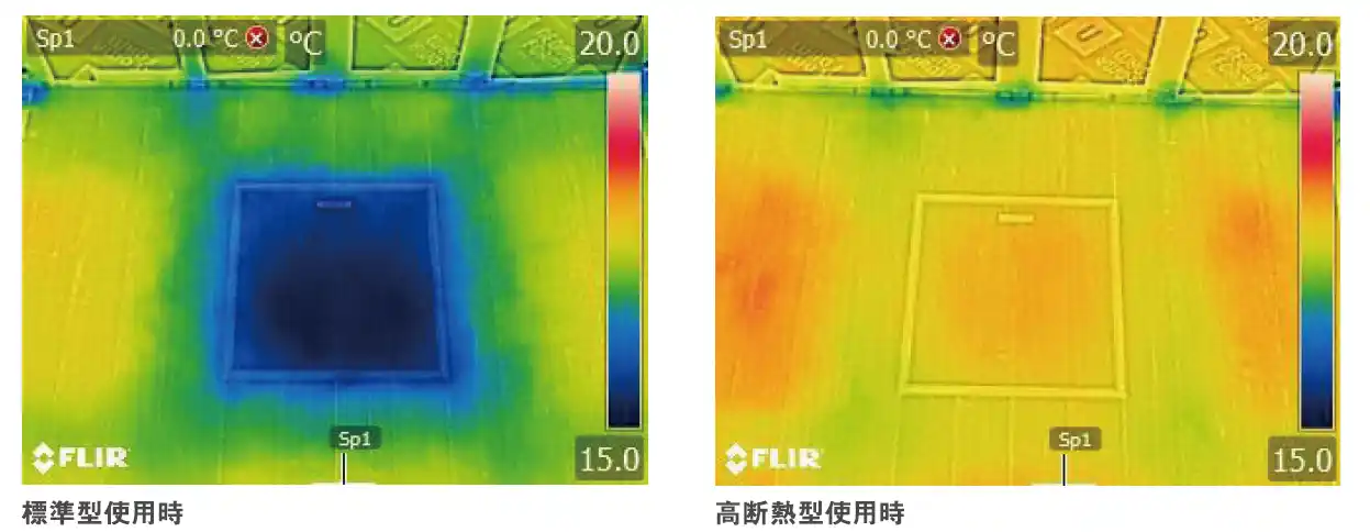 | 法律の改正に伴う住宅の高断熱化もあり、床全体と床下点検口部の温度差を無くしたいという要望に応え、これまでの0.34W/(平方メートル ・k)から0.26W/(平方メートル ・k)と大幅に性能を上げております。 | |||||||||