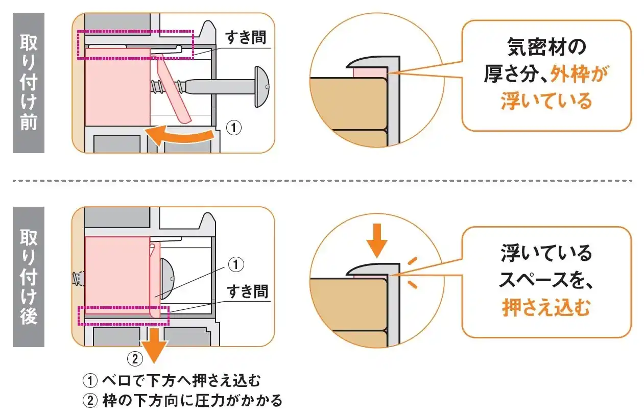 | また、フタ部分のシールパッキンと枠部の気密材の二重の気密対策、さらにはJoto製の高気密型床下点検口の大きな特徴である「スライドコア方式」により、施工者の技術レベルに左右されることなく省施工で高い気密性を発揮します。 | |||||||||