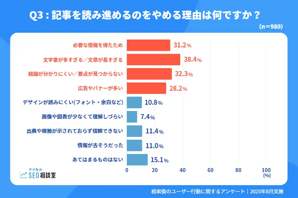 | 検索結果から記事を訪れたユーザーが「読み進めるのをやめる理由」で最も多かったのは、「文字量が多すぎる/文章が長すぎる」(38.4%)、次いで「結論がわかりにくい/要点が見つからない」(32.3%)、「必要な情報を得たため」(31.2%)が続きました。 | |||