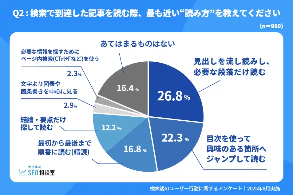 | この設問では、検索を通じて記事に到達したユーザーが実際にどのような読み方をしているのかを尋ねました。 | |||