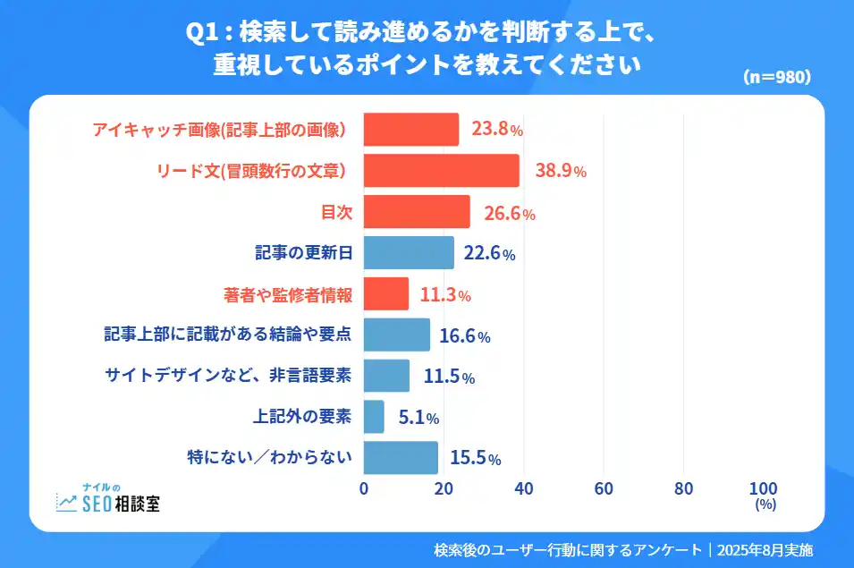 | 検索結果から流入したユーザーが、その記事を読み進めるかを判断するポイントとして、「リード文」(38.9%)と「目次」(26.6%)が上位となりました。 | |||