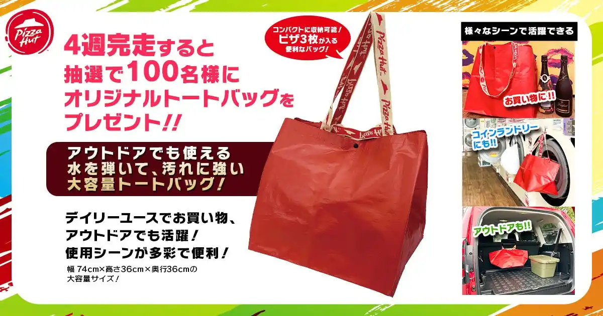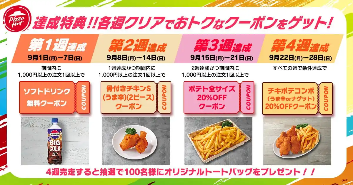 毎週1回以上、税込1,000円以上のご注文で各週の特典クーポンを獲得できます。さらに、4週連続達成したお客様の中から抽選で100名様にピザハットオリジナルトートバッグが当たります。 |