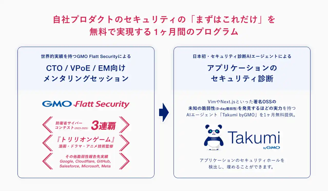 GMOインターネットグループで「エンジニアの背中を預かる」をミッションに、プロダクト開発組織に向けたサイバーセキュリティ関連事業を展開するGMO Flatt Security株式会社(代表取締役社長:井手 康貴 以下、GMO Flatt Security)は、2025年9月1日より、「GMO Flatt Security エンジニア応援プログラム」を開始いたします。本プログラムは、セキュリティの専門家による個別面談と、日本初・セキュリティ診断AIエージェント「Takumi byGMO」の提供を通じて、企業のセキュリティ体制の構築を支援する1ヶ月間の無料プログラムです。AIで開発スピードが高速化する一方、セキュリティ専門家が不在の組織でも安心して開発に専念できるよう、セキュリティ対策の第一歩を支援します。 |