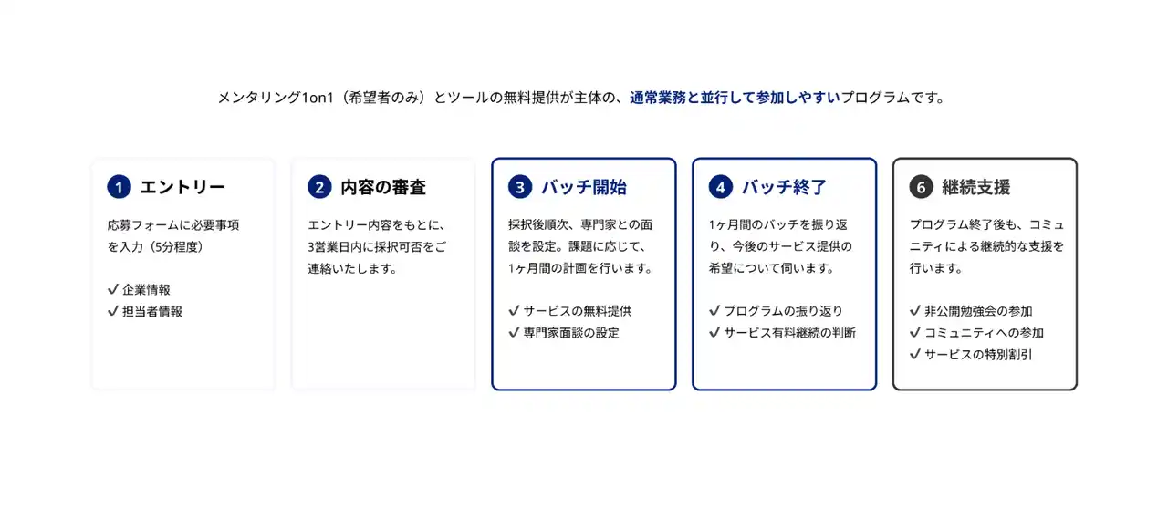 プログラムは複数のバッチに分けて実施されます。プログラム開始に先立ち、2025年8月からベンチャーキャピタル(VC)経由で対象企業様へのご案内をしておりましたが、2025年9月1日より、第1期を正式に募集開始いたします。なお、初回の対象はスタートアップ企業です。 |