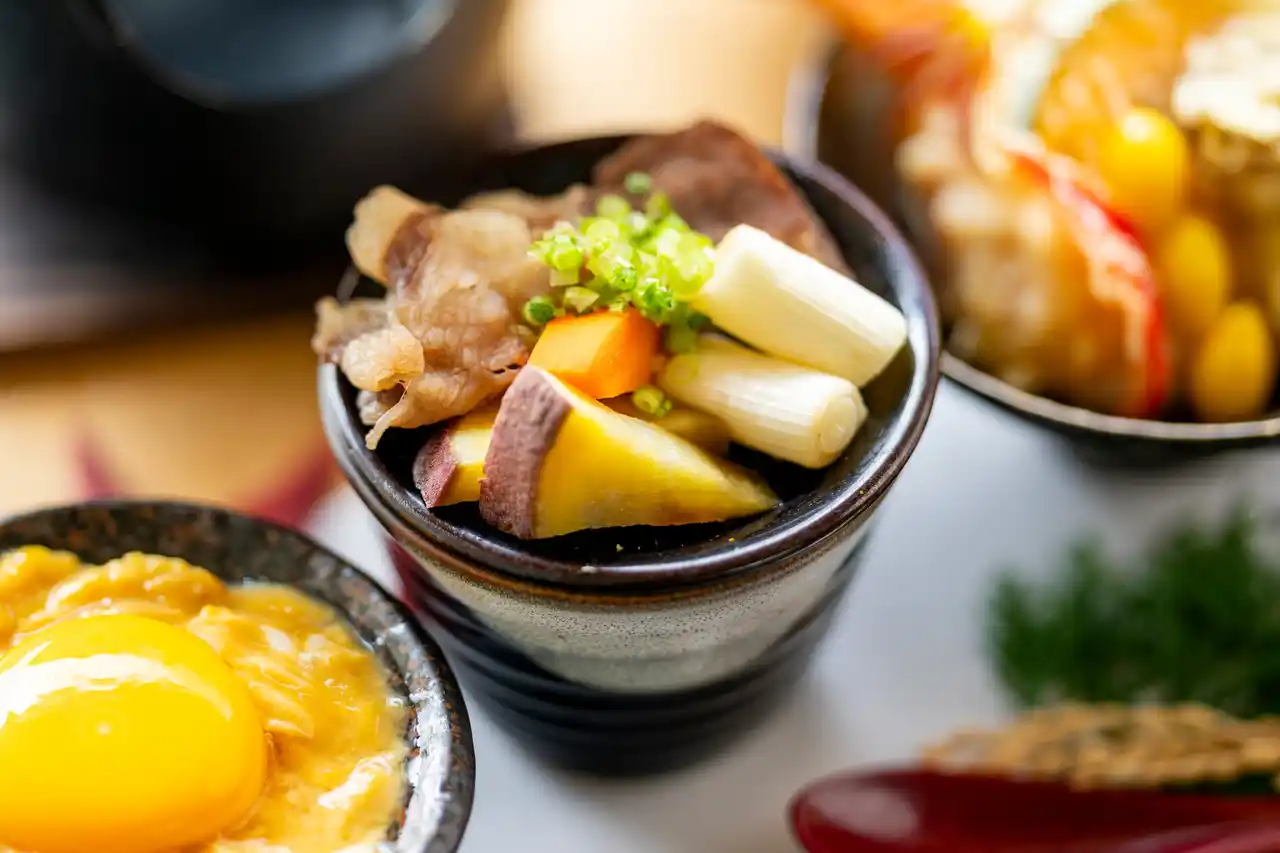 和牛の肩ロースを甘辛いすき焼きタレに絡め、旬のさつま芋、白葱と共に炊き上げました。 |