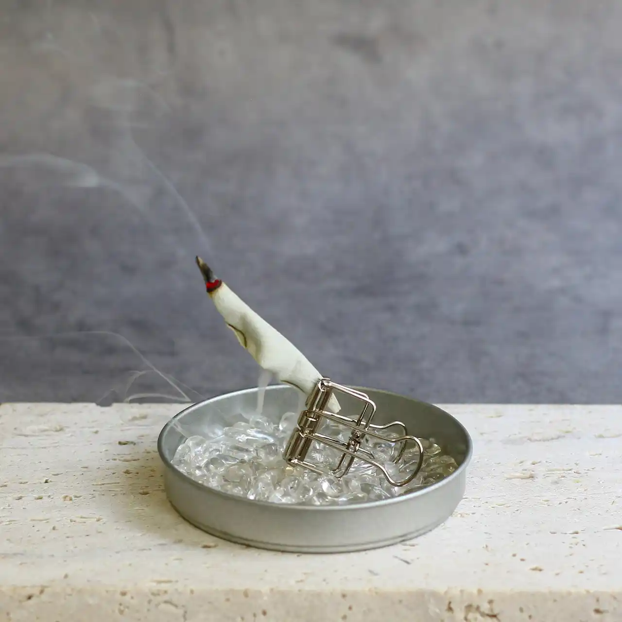 1.缶蓋の内側や耐熱性のある容器に水晶さざれ石を敷いてください。 2.ホワイトセージの葉を1枚取ってクリップ上部に挟み ホワイトセージに火をつけてください。 炎が安定したら吹き消し、煙だけが出る状態にします。 3.水晶さざれ石の上にクリップだけが触れる状態で置いてください。 煙が自然に消えるまでお楽しみいただき完全に鎮火したのを確認してください。 |