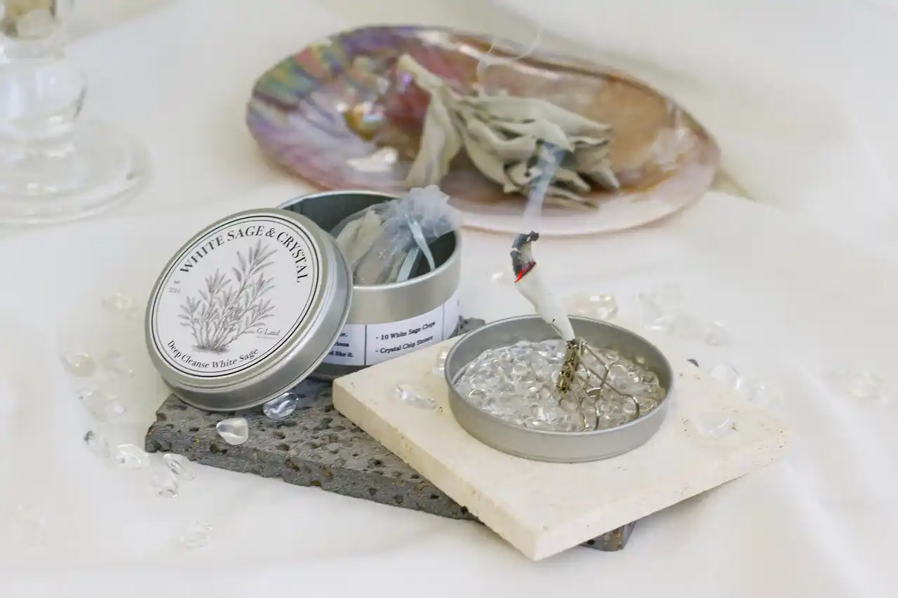 「使ってみたいけど、焚き方が分からない」「まずは少量から試したい」そんな声に応えて誕生したのが、1枚ずつのセージ葉と本物の天然石(クリスタル(水晶))を詰めた缶入りタイプ。専用のクリップ入りで、缶を香炉として火をつけるだけで手軽に浄化が始められます。毎日のリフレッシュに1葉ずつ使える、初心者におすすめのセットです。 |