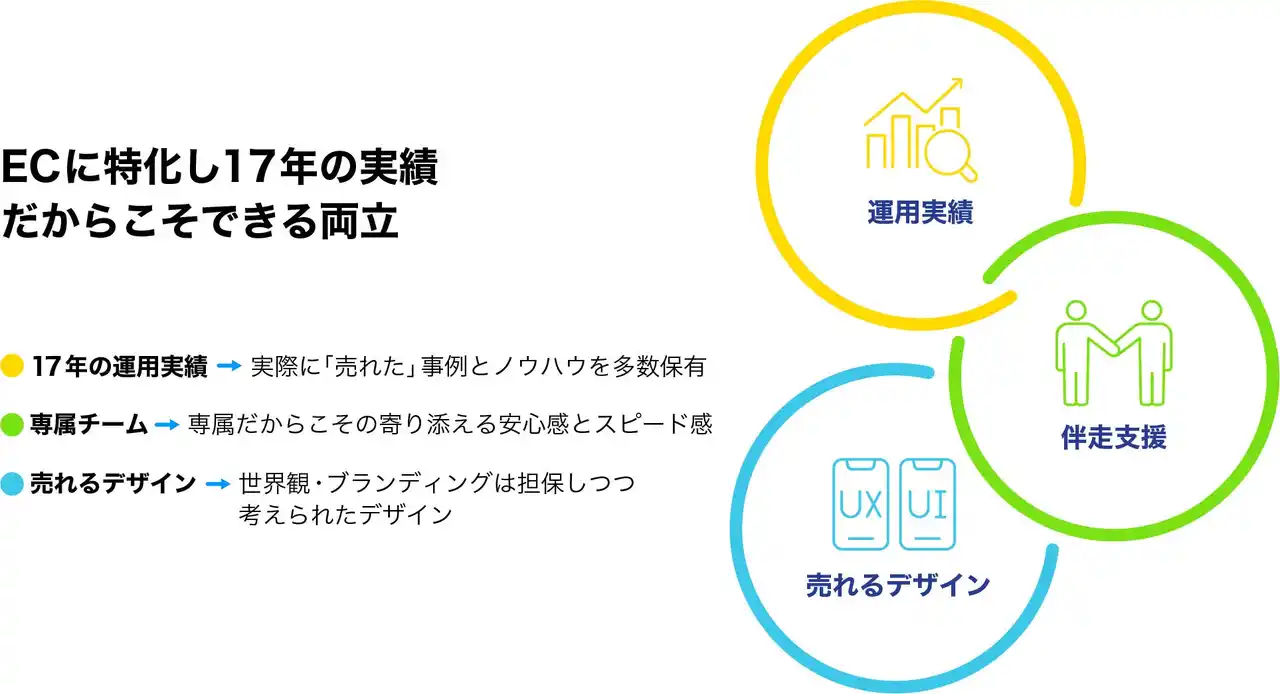 本サービスは、200社以上・17年にわたるEC構築・運用の実績をもとに、デザイン力と運用知見を融合。スピーディーかつコスト効率の高い構築と、公開後の伴走支援により、売上に直結するECの実現を支援します。 |