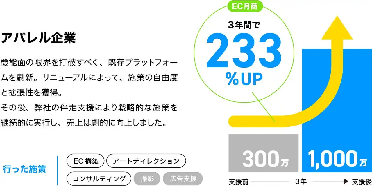 アパレル:リニューアル後、月商300万円から1,000万円(+233%)に増加。高速構築と機能拡張が鍵となりました。 |