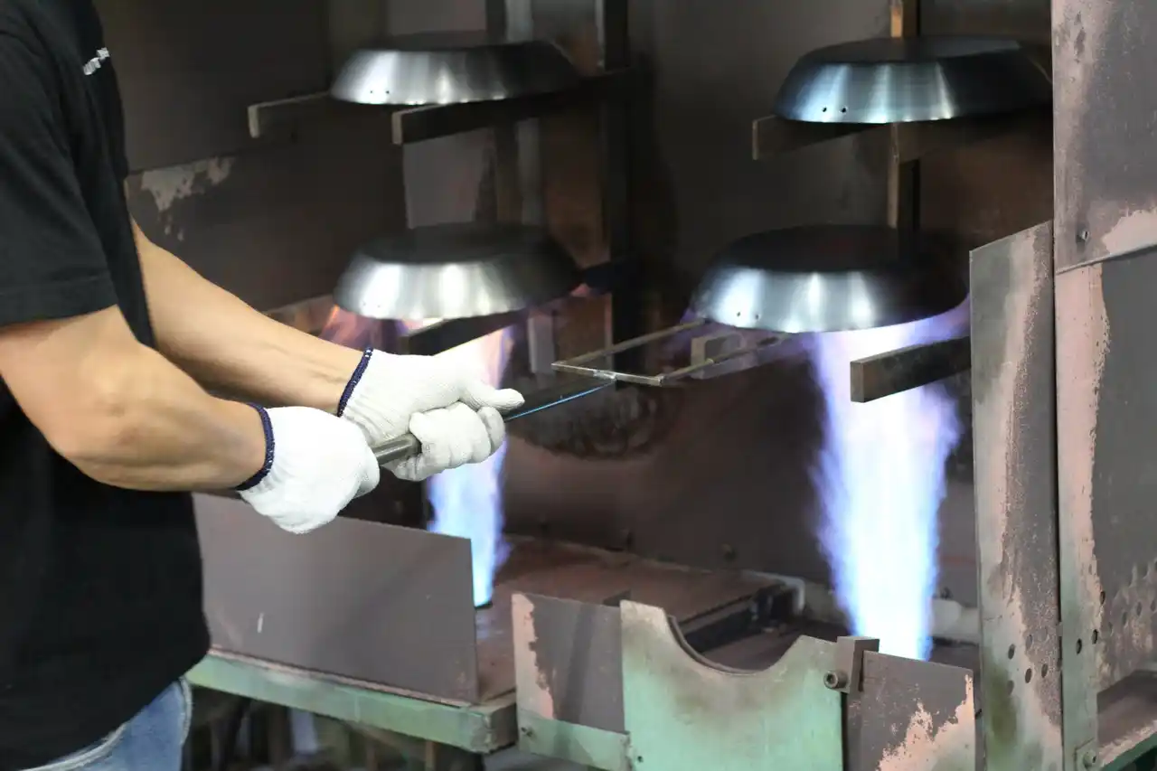 | 鉄板の温度が700°になるまで高温バーナーで焼きます。一定時間冷ました後、食用のオリーブオイルで馴染ませます。この加工をすることで、通常の鉄フライパンでは必要なご自宅での「油ならし」が不要になります。さらに、ハードテンパー加工をすることで「油ならし不要」に加えて、最初から油も馴染んでおりますので、「焦げ付き」や「こびりつき」「さび」やすさを軽減しております。ご自宅に届いてから、水洗いですぐにご利用いただけます。 | ||||||||||||||