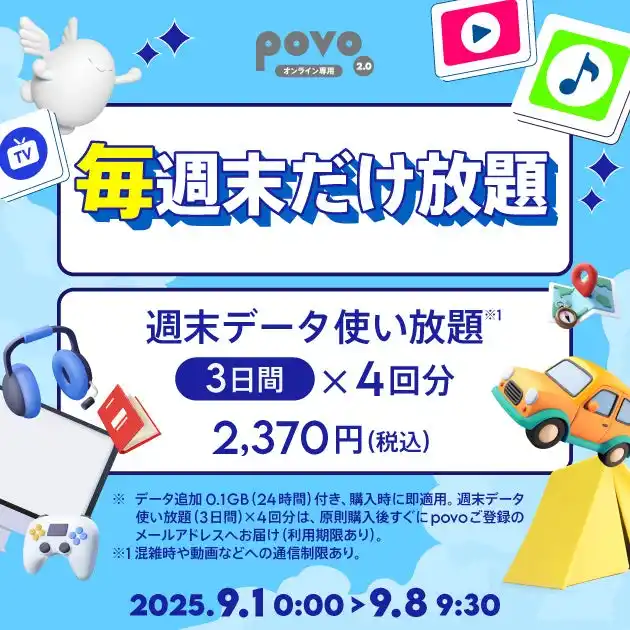 KDDI、沖縄セルラーは2025年9月1日から、povo2.0の期間限定トッピングとして、データ使い放題(注1)のまとめ買いトッピング「povoの通勤・通学定期」2種と、「週末データ使い放題(3日間)」を4回分使うことができる「毎週末だけ放題」を提供します。 |
