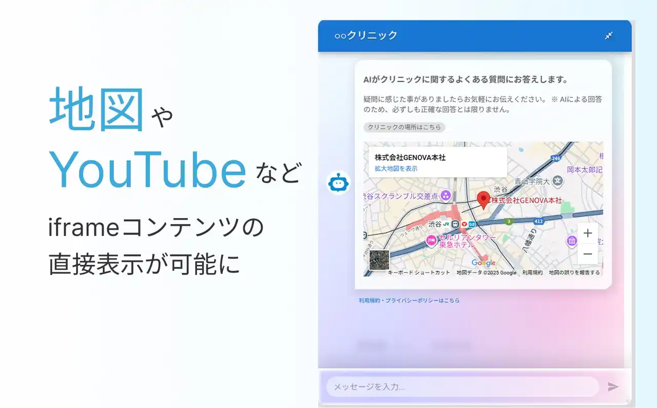 加えて、挨拶メッセージ欄や回答時に「地図」や「YouTube」などのiframeコンテンツ、さらに画像も直接表示できるようになりました。これにより、患者さんはテキスト情報だけでなく、視覚的かつ直感的な情報を受け取ることが可能となり、例えば医療機関へのアクセス方法を地図で確認したり、院内の様子を動画や画像で視聴したりするなど、より利便性の高い情報収集が可能となります。 |