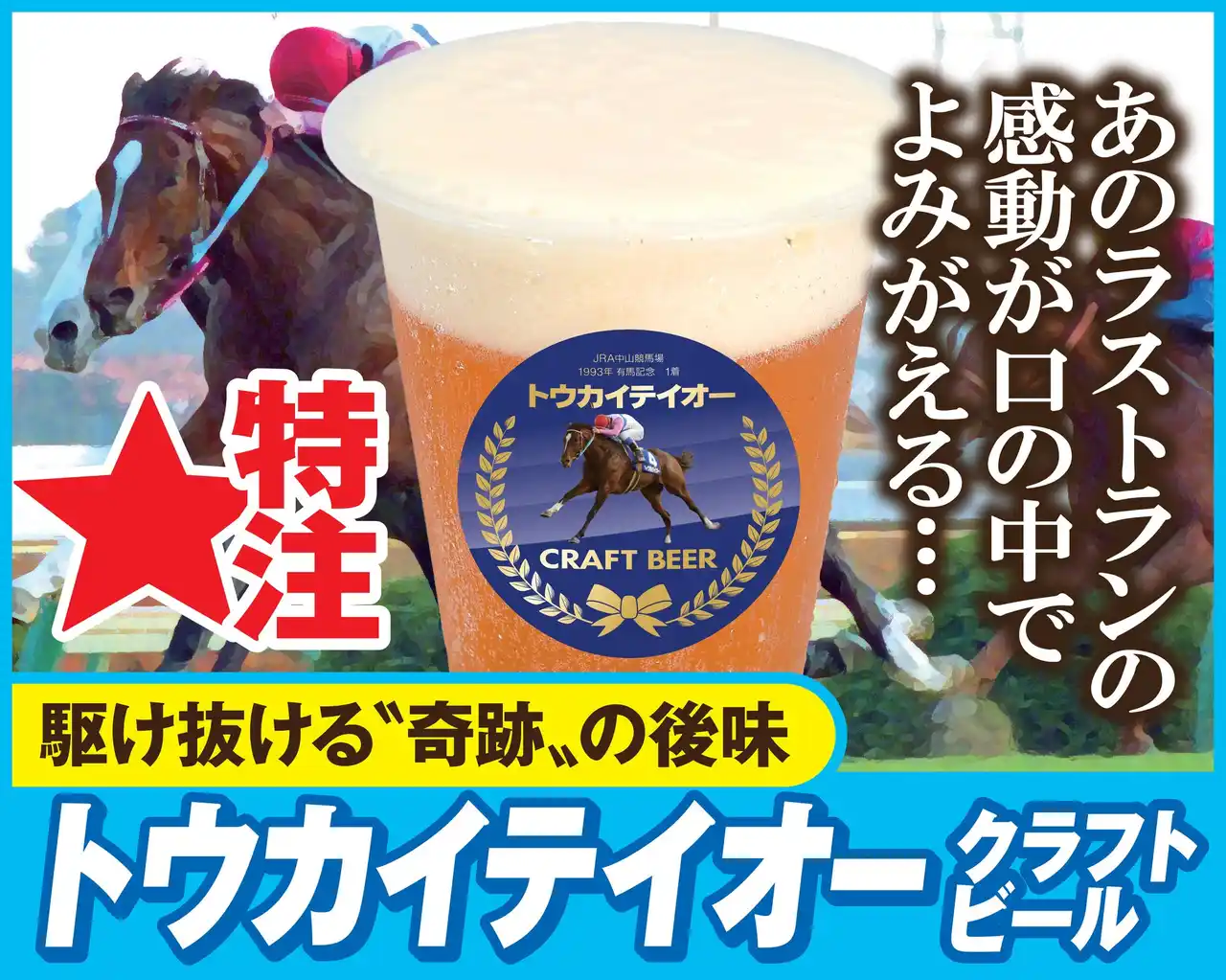 そして、生ビールも当社プロデュース。その名も「トウカイテイオー クラフトビール」。名馬トウカイテイオーが“奇跡”を起こした有馬記念、その舞台でもある中山競馬場にふさわしいビールです。 |