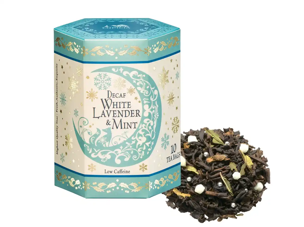 スマスティーをご用意しています。さらに今年は、近年ますます注目度が高まっているカフェインレスの需要に応えるため、「デカフェ・キャロル」に加えて新発売の「デカフェ・ホワイトラベンダー&ミント」もラインアップ。シーンを選ばず手軽に楽しめるティーバッグタイプをクリスマス限定デザインBOX入で展開します。 |