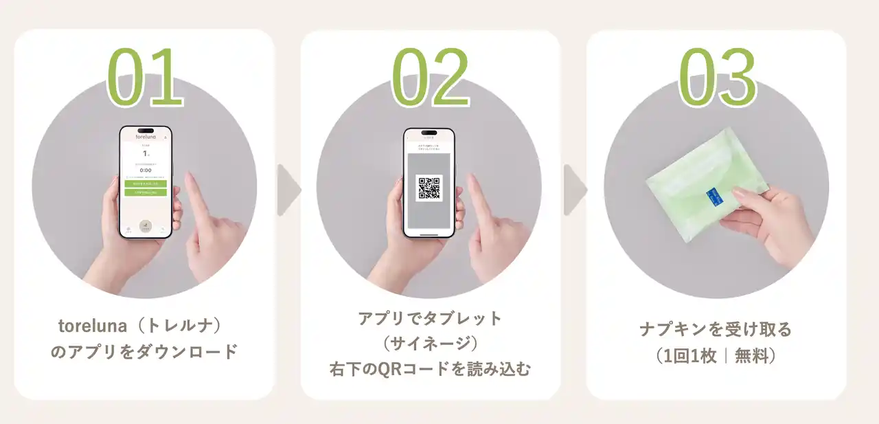 トイレットペーパーと同様に、生理用ナプキンについてもさまざまな施設で無償提供できるようにしたい。そんな想いから本サービスは生まれました。トレルナは、スマートフォンアプリとトイレ内のディスペンサーが連動することで、ナプキンが無料で受け取れるサービスです。トレルナが設置されているトイレ個室に入るとデジタルサイネージにトレルナパートナーの動画が表示され、持続的にサービスを提供できる仕組みとなっています。 |