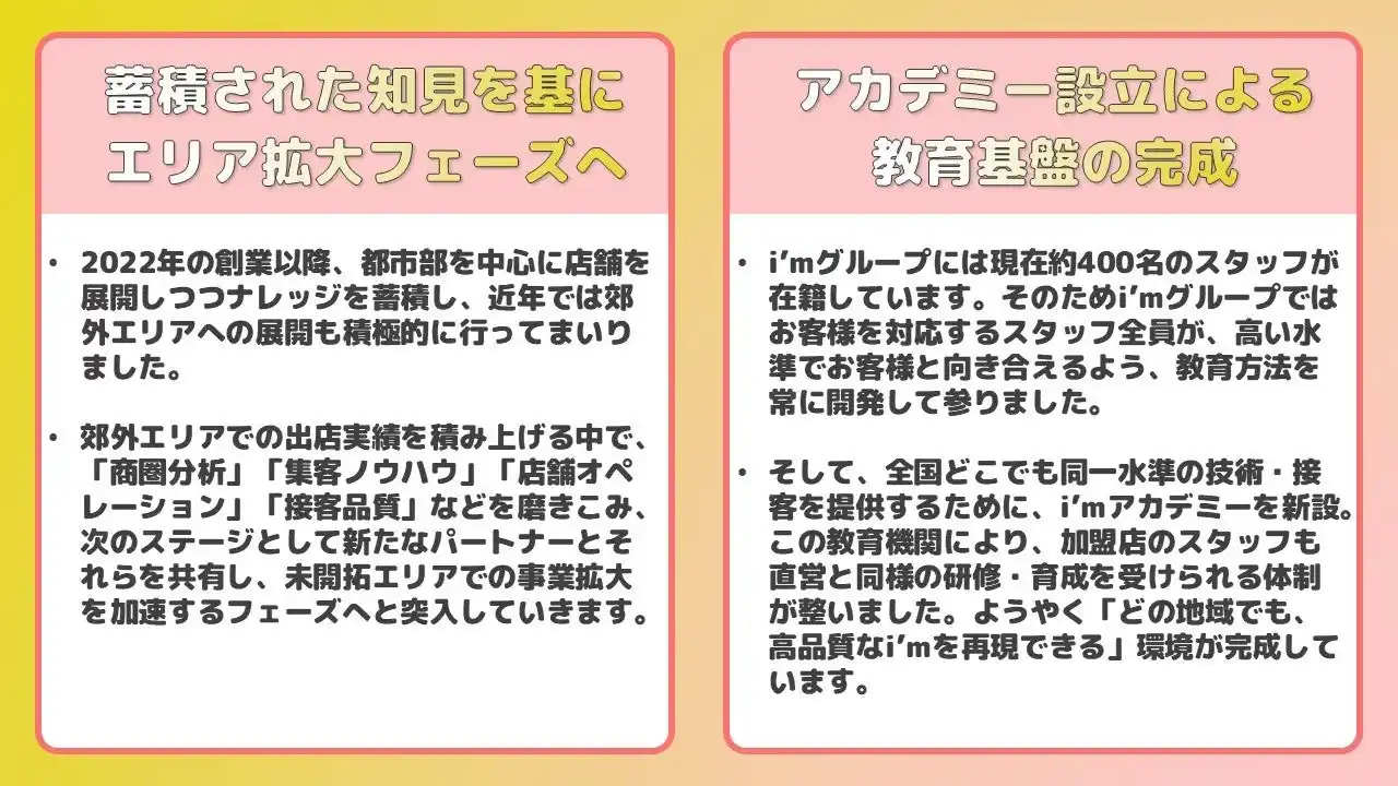 創業以来、わずか3年半で全国120店舗へと急成長を遂げた裏側には、「直営展開」にこだわり抜き、“再現性ある成功モデルの確立”に集中してきた背景があります。実は創業以降、フランチャイズ展開は一定期間クローズしており、限られたパートナー様のみでフランチャイズを運営し参りました。クローズしていた期間にも、フランチャイズに関して多くのお問合せを頂いておりましたが、”成功モデルの確立”に集中すべく、お断りをさせて頂いておりました。そしてこの度、i'mグループのネクスト戦略として、さらなる「エリア展開」を加速させるべく、「10社限定」で戦略フランチャイズオーナー募集を戦略的に再開いたします。 |