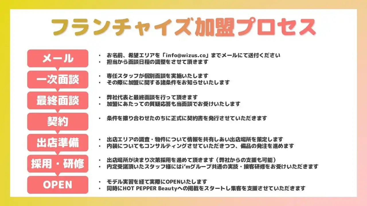 加盟をご希望の方は、メールにてお問合せ下さい。その後、専任スタッフおよび代表より面談をさせて頂きます。その後、出店の準備から採用、そしてOPENに至るまで本部が併走させていただきます。 |