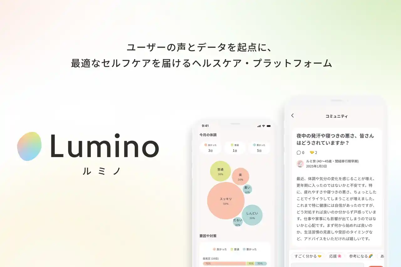 【プレ更年期・更年期世代向けアプリ「Lumino(ルミノ)】 ルミノは、プレ更年期~更年期世代のための月経・体調管理アプリです。更年期医療の専門医監修のもと、世代特有の体調の変化やお悩みに寄り添う機能を有しているのが特徴です。サービス開始から約6ヶ月でユーザーが1.5万人を突破し、2025年にはネイティブアプリ化を目指しています。 |