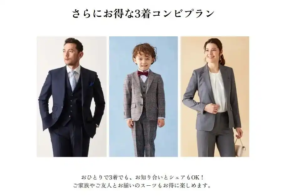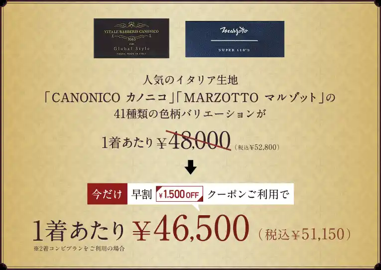 ※ コンビプラン・・・オーダースーツを2着以上ご購入していただいた場合の1着あたりのお値段です。組み合わせは自由ですので、異なる価格帯のオーダースーツと組み合わせていただいても本価格が適用されます。 |