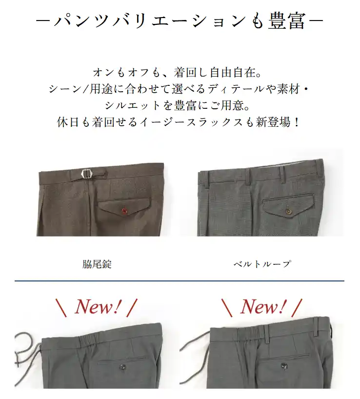 オン・オフ問わず着回しできるイージースラックスが新登場しました。 お好みの素材・シルエットで新しいパンツスタイルをお楽しみください。 |