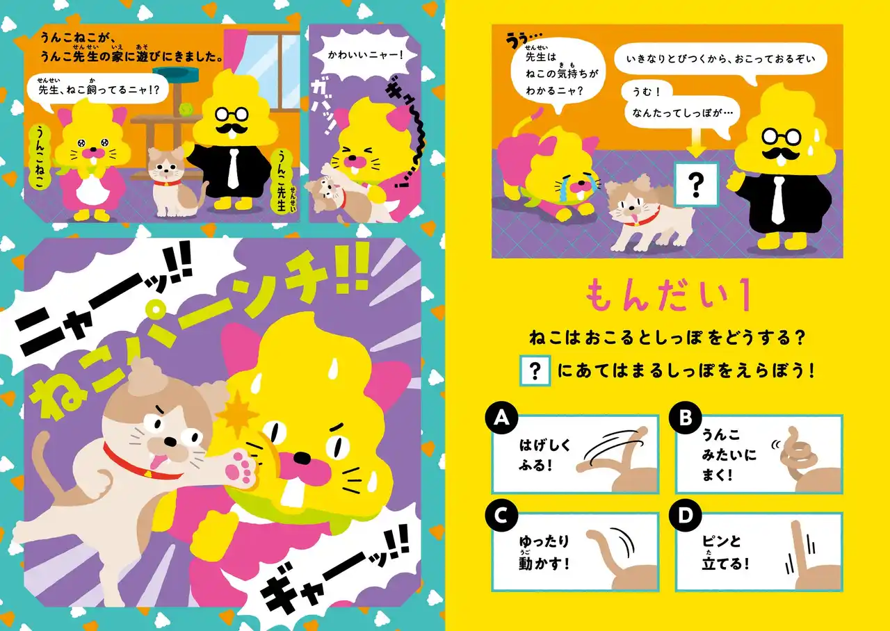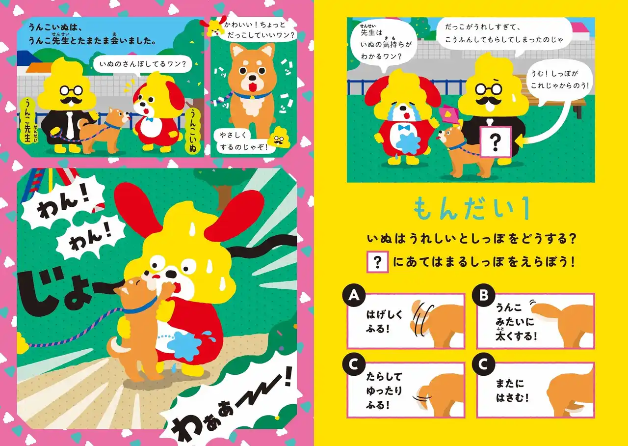 物語は、“うんこいぬ” と “うんこねこ”がわんちゃん・ねこちゃんと出会い、「仲良くなるにはどうすれば?」という疑問から、出会いの場面で大切なポイントを知る展開へと続きます。 |