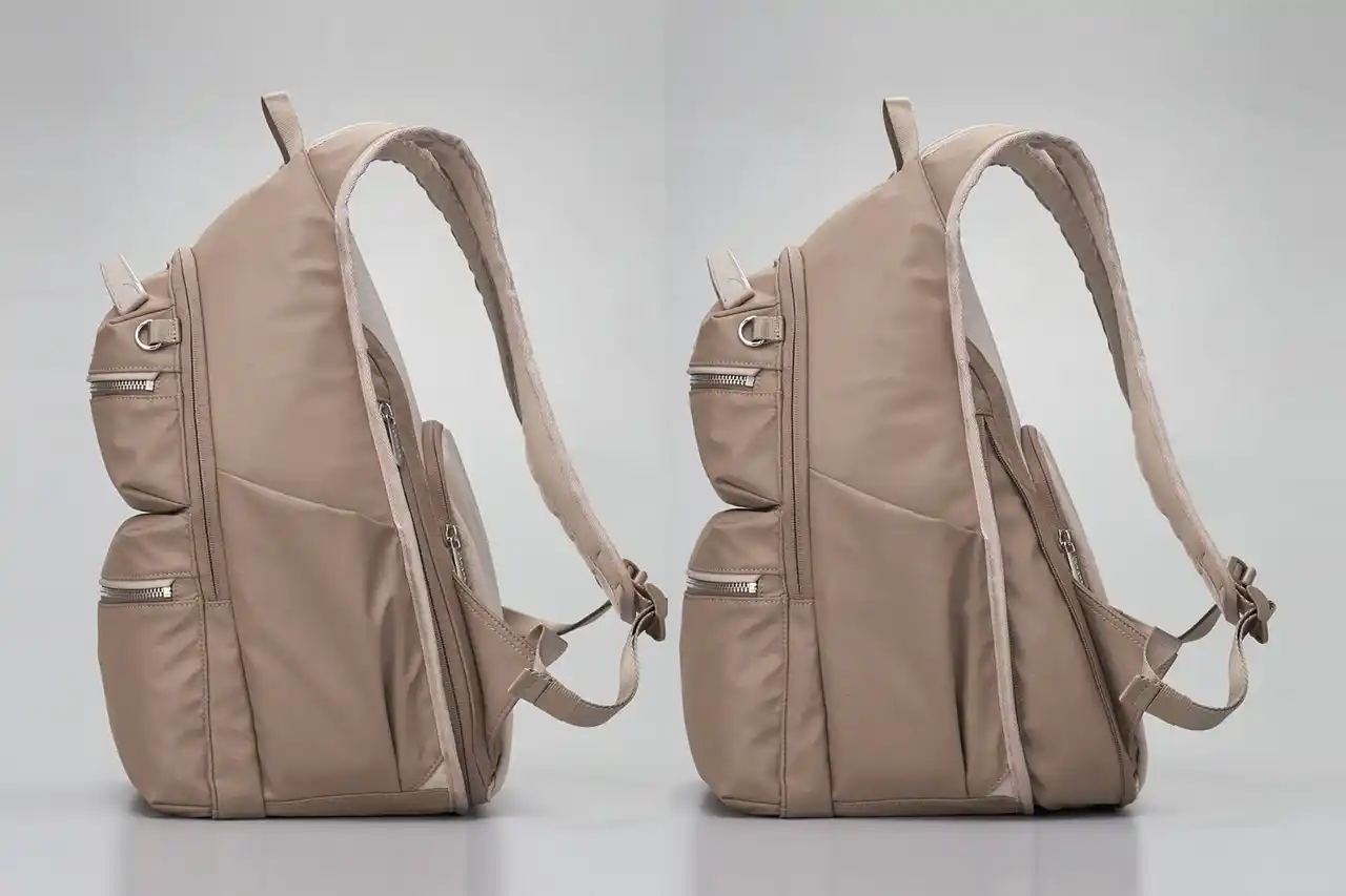 サイドファスナーを開くと底面が大きく広がる仕様で、丸みのあるコンパクトなシルエットを保ったまま、容量を増やすことができます。 |