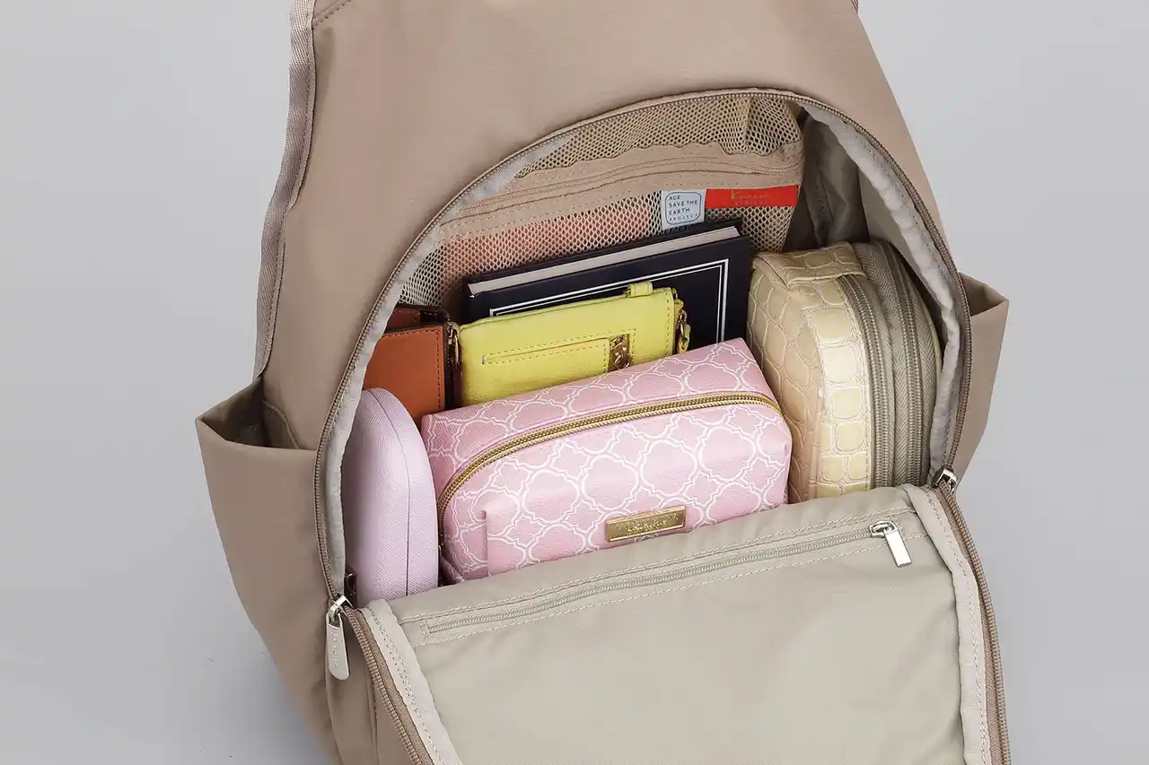 日帰り温泉に必要なアメニティなどを入れておける大きなメッシュポケットや、小物の収納に便利な各種ポケットを配置しました。 |