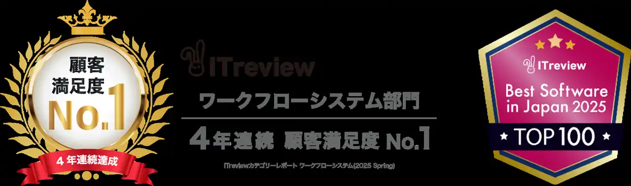 | 2025年4月には、ITreviewが発表する「ITreview カテゴリーレポート 2025 Spring」ワークフローシステム部門において、4年連続(16期連続)で顧客満足度No.1に選出されました。 | |||