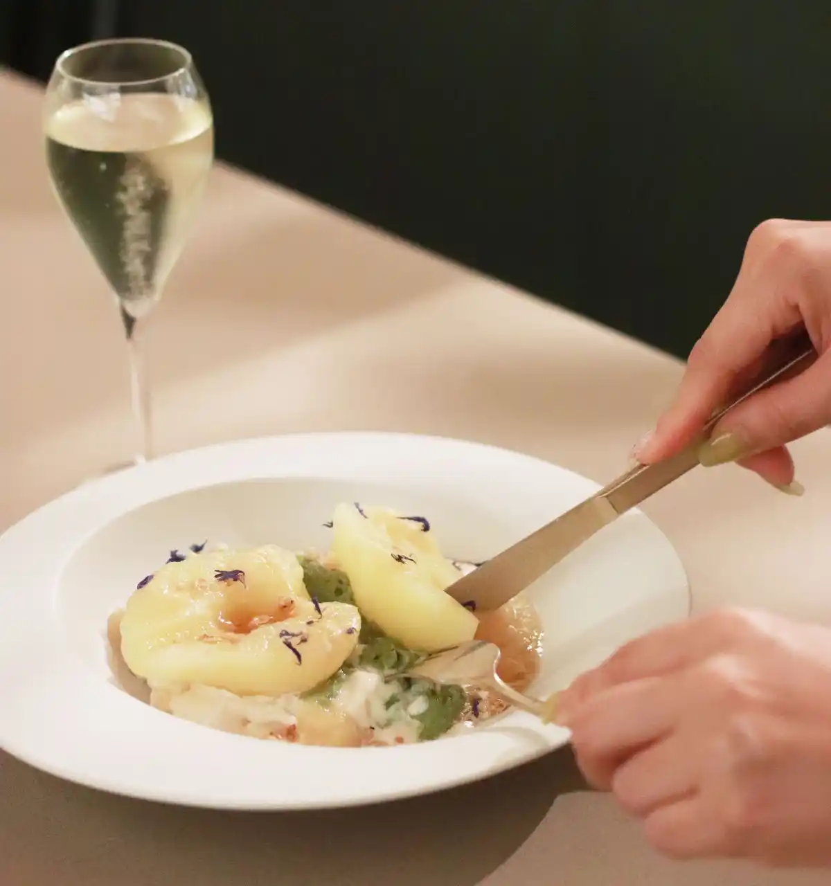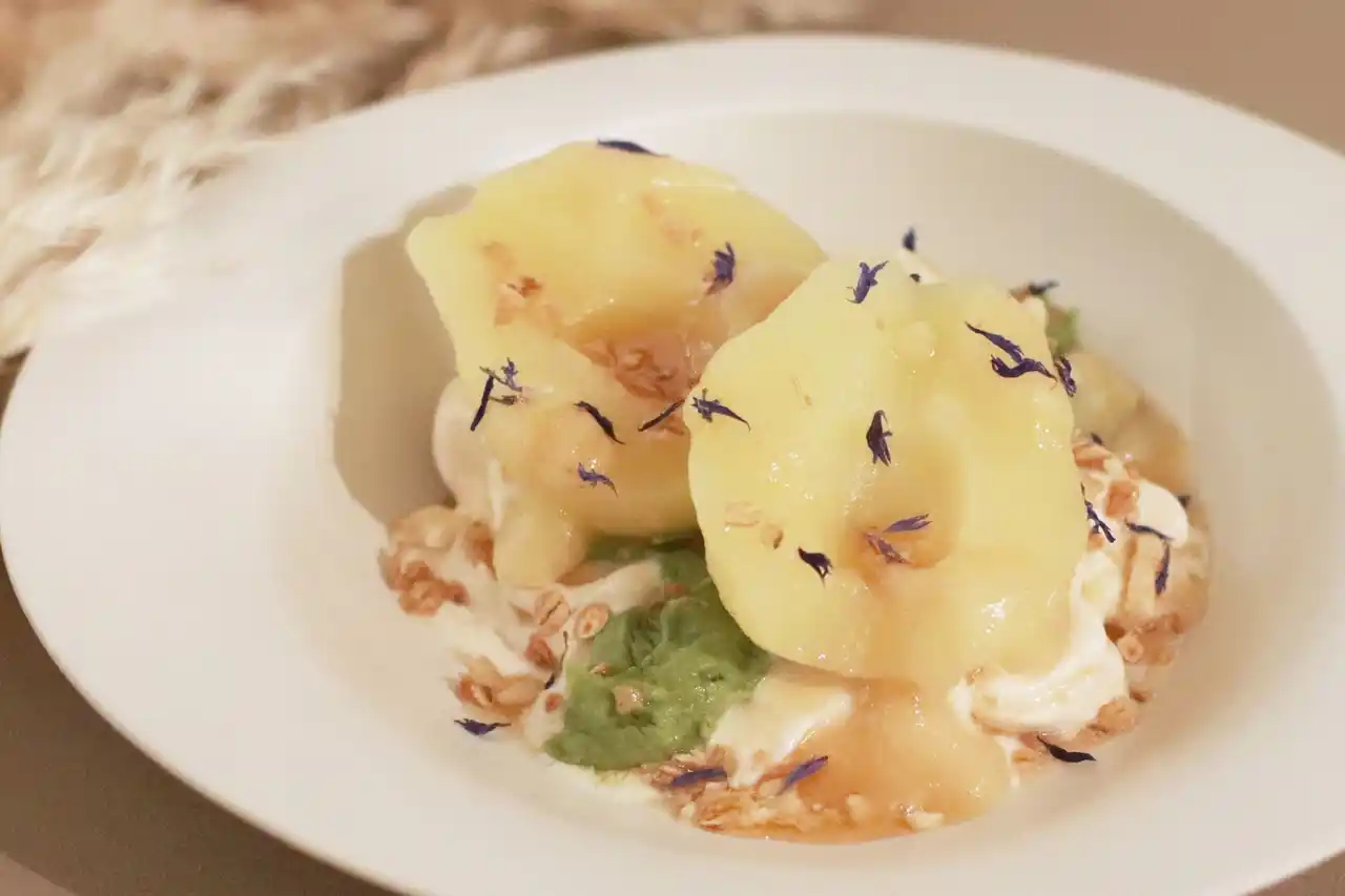 Adaptation自慢の自家製ヴィーガンソフトクリームと宇治抹茶が豊かに香る特製カスタードクリームの上に、シャリっとした食感を残してコンポートにした洋梨をほぼ丸々1個分載せた、贅沢なひと皿です。 |