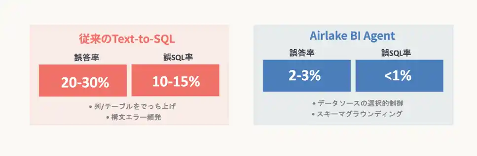 AIがデータベースの構造を正しく理解する「スキーマグランディング」や、RAG(Retrieval-Augmented Generation)技術を駆使することでハルシネーションのリスクを1%未満に抑制し、極めて高品質なデータ抽出を可能にしました。 |