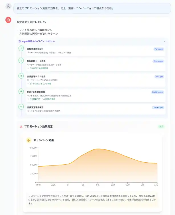 「“過去3ヶ月以内に購入履歴があり、直近1ヶ月以内にメルマガを開封したユーザー”を抽出して、キャンペーンAとBでのコンバージョン率を比較して」などの自然言語指示により、セグメント定義からSQL生成、結果の可視化、インサイトの要約までを自動実行。 |