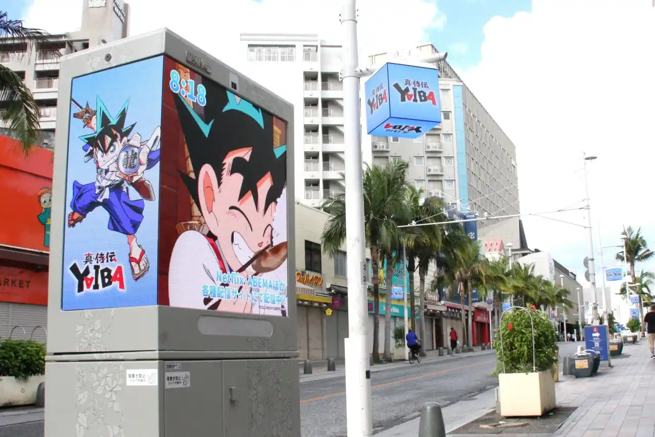 沖縄・那覇のメインストリートである国際通りに沿って設置された合計98台の屋外デジタルサイネージ「国際通りストリートビジョン」は、人気アニメ『真・侍伝 YAIBA』とのタイアップにより、主人公「鉄 刃(くろがね やいば)」が午前8時18分と午後8時18分に“時報”として登場する特別企画を開始いたします。鉄刃の声を担当する高山みなみさんの収録による特別音声が、来街者へユニークな時間案内体験を提供します。 |