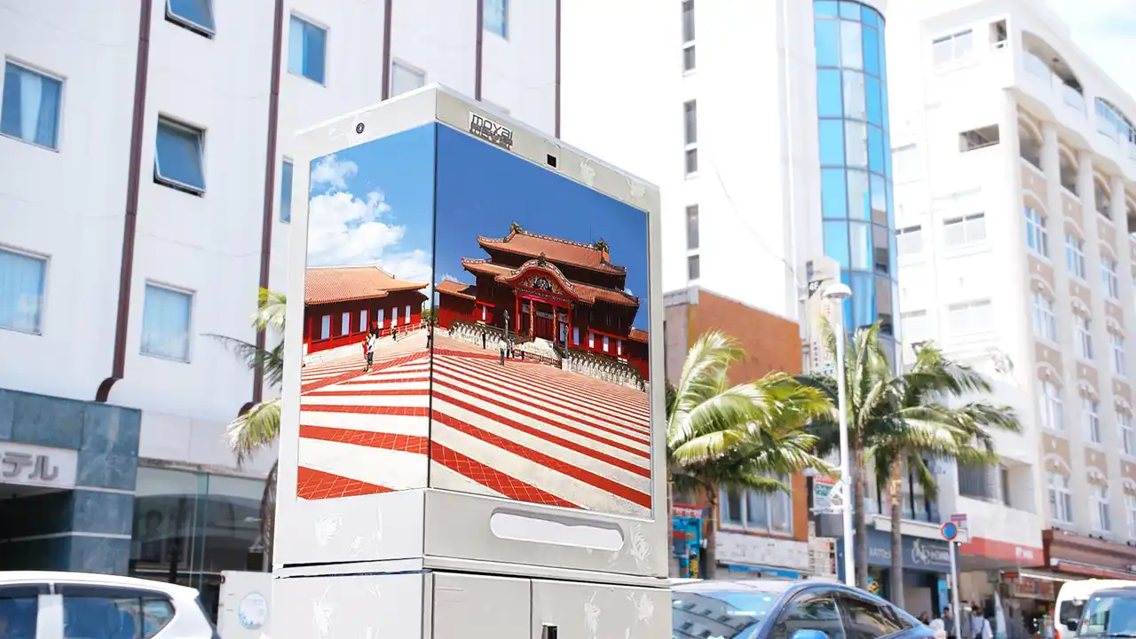国際通りストリートビジョンは、日本屈指の観光地・沖縄県那覇市の「国際通り」に設置された屋外デジタルサイネージです。全長約1.6kmにわたる国際通り沿いには、それぞれ異なる特長を持つ「スカイキューブビジョン」と「パワーグリッドビジョン」の2種、合計98台が設置されており、連続性のある屋外デジタルサイネージとしては国内最大規模を誇ります。 |