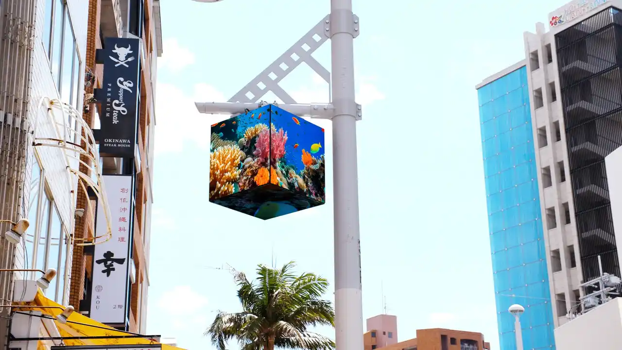 「国際通りストリートビジョン」は、観光客や地元住民を含む1日あたり数十万人以上に接触できる高い視認性を誇るデジタルサイネージです。設置された98台(49台のパワーグリッドビジョン+49台のスカイキューブビジョン)により、約1.6kmにわたる通りをカバーするため、通行者に一体的な情報体験を届けることが可能です。 |